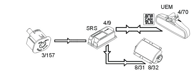 If the position of the switch is changed from "on" to "off", the level of current at the two Hall sensors connected to the switch changes. The Hall sensors transmit the altered current levels to the supplemental restraint system module (SRS) (4/9) via directly connected cables.