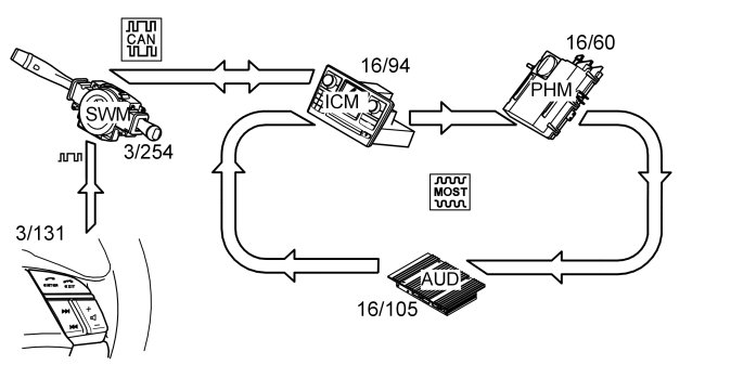 When using the menu via the steering wheel buttons (3/131) information is transmitted from the steering wheel module (SWM) (3/254) to the infotainment control module (ICM) via the CAN network. The information is then transmitted to the phone module (PHM) via the MOST network.
