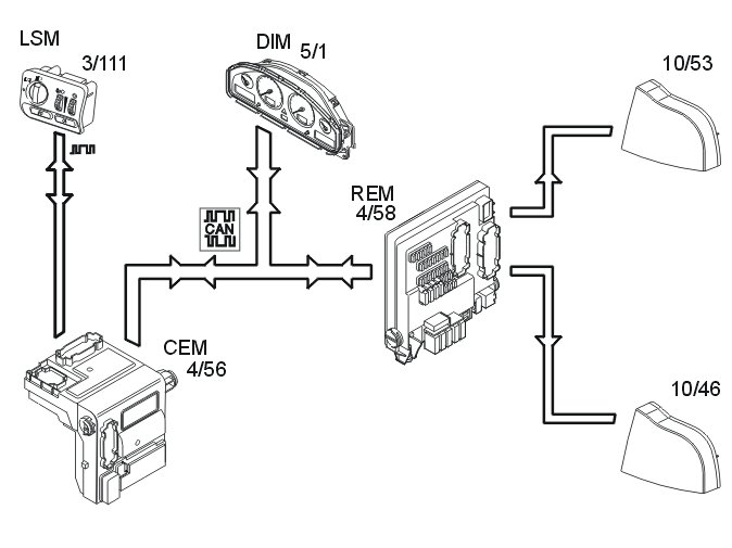 The rear fog lamps (10/46, 10/53) are activated by pressing the button for the rear fog lamps in the lamp switch module (3/111). The light switch module (LSM) transmits a request to light the lamps to the central electronic module (CEM) (4/56) using serial communication. The central electronic module (CEM) transmits the request to the rear electronic module (REM) (4/58) via the Controller area network (CAN).