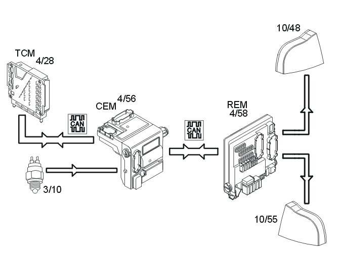 The central electronic module (CEM) transmits the data via the controller area network (CAN) to the rear electronic module (REM) which activates the lamps.