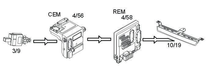 When the stop lamp switch (3/9) is closed, a signal is transmitted to the central electronic module (CEM) (4/56). The signal is transmitted from the central electronic module (CEM) to the rear electronic module (REM) (4/58) via a directly connected cable. The high mounted stop lamp is supplied with power directly from the rear electronic module (REM). The stop lamp is supplied with power for as long as the stop lamp switch is closed.
