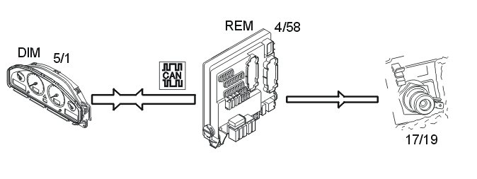 The rear electronic module (REM) sends the status of the lamp fault via the Control area network (CAN) to the central electronic module (CEM). In the event of a fault, the central electronic module (CEM) transmits data via the Control area network (CAN) to the driver information module (DIM) which displays a text message.