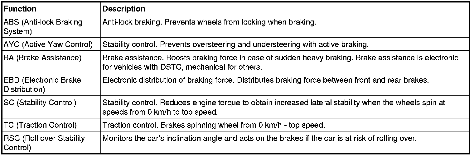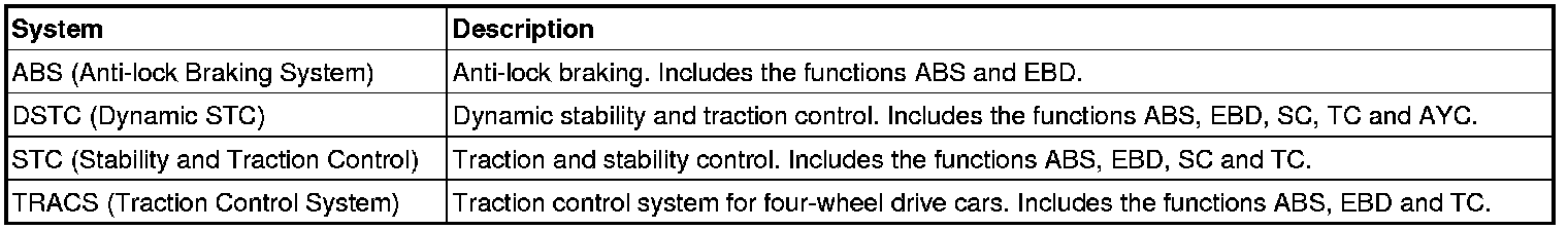 All functions below are not available in all vehicles or vehicle models. The brake system can consist of only ABS or ABS including TRACS, STC, or DSTC.