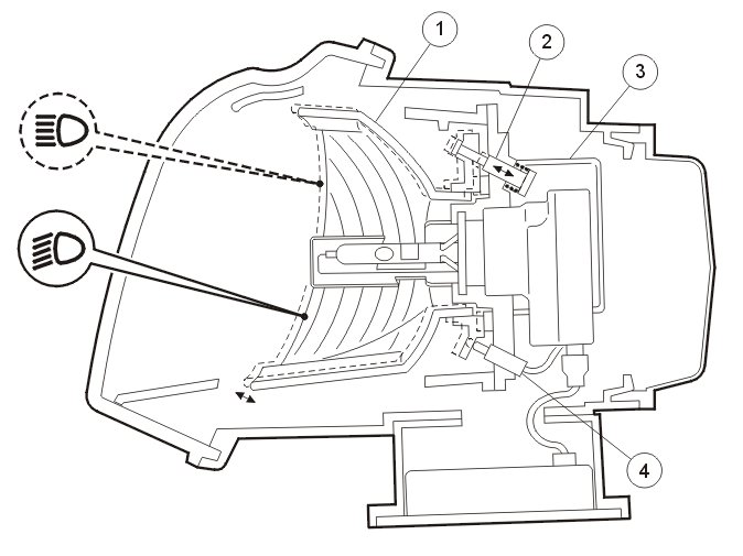 The reflector has a complex shape in which different segments are used depending on whether high beam or low beam is in use.