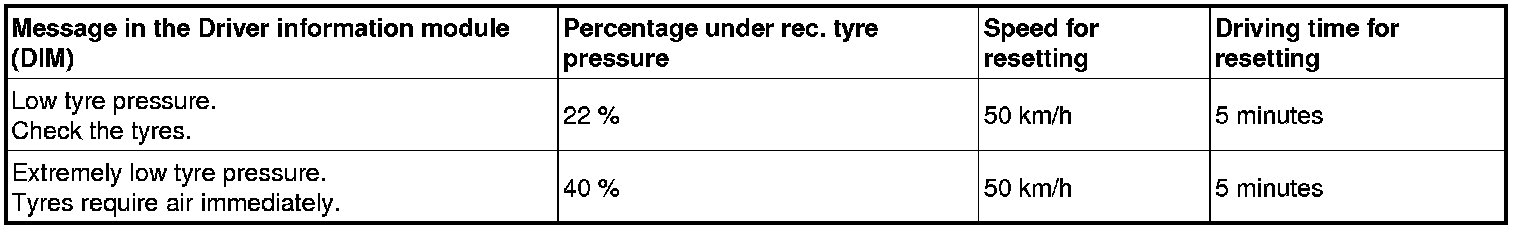 If the pressure reported from a sensor differs more than 22% from the recommended value, a warning message will be shown in the Driver information module (DIM).
