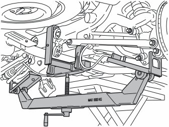 - Take the workshop lift and position it under the lateral link's rear mounting in the wheel spindle to relieve the load from the screw for the lateral link's front mounting.