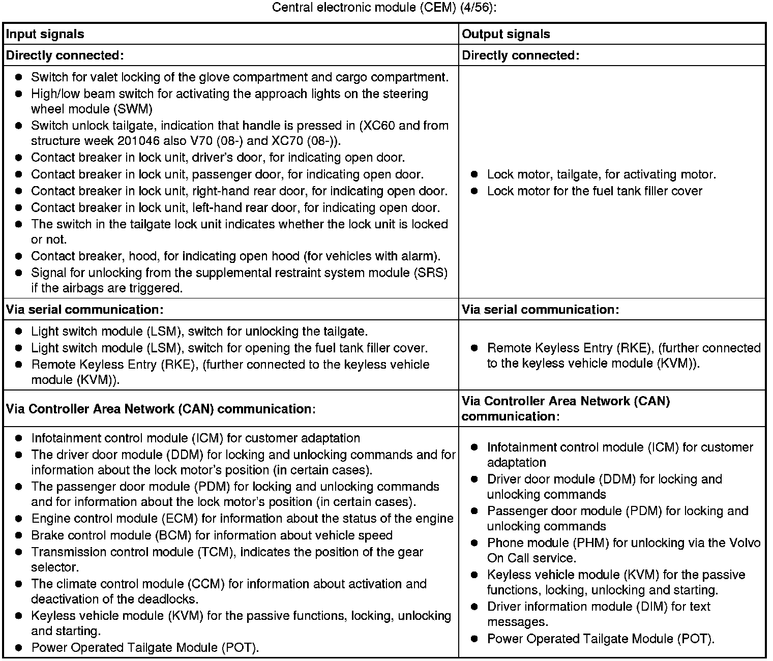 The tables below summarize the input and output signals to the units in the central locking system. The signal types are divided into directly connected signals, serial communication and controller area network (CAN) communication.