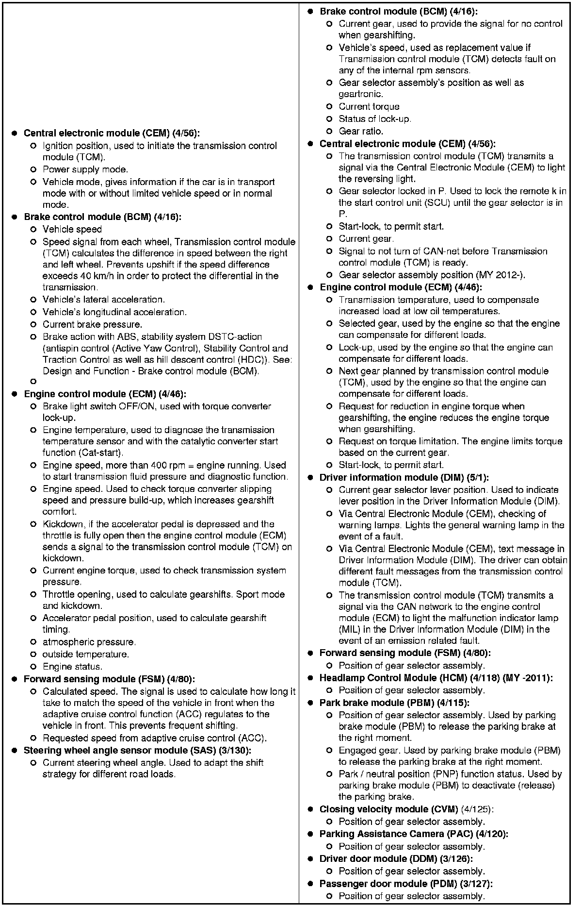 - Gear selector module (GSM) - Provides transmission control module (TCM)information such as Geartronic mode.