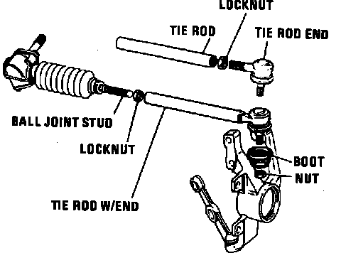 Toe-in can be adjusted by turning tie rod ends in or out as necessary. Either of two types of tie rods may be used, Fig. 1. If tie rod is supplied with sleeve, separate from tie rod end, adjust toe by loosening locknuts and turning sleeve. If rod is supplied with sleeve and tie rod end in one piece, adjust toe by loosening locknut and turning steering rack ball joint stud.